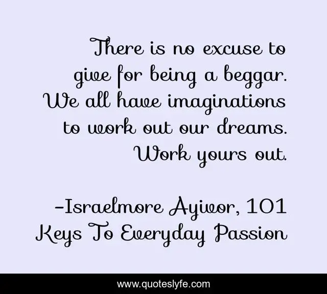 This page presents the quote "There is no excuse to give for being a beggar. We all have imaginations to work out our dreams. Work yours out.". Author of this quote is Israelmore Ayivor, 101 Keys To Everyday Passion. This quote is about food-for-thought, work-hard, beggar, quotes, excuse, imaginations, potentials, personal-development, israelmore-ayivor,.
