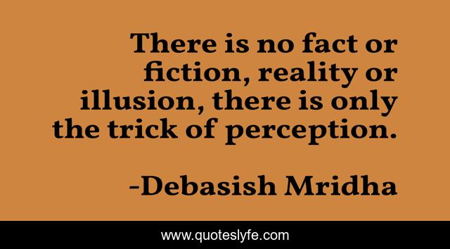 This page presents the quote "There is no fact or fiction, reality or illusion, there is only the trick of perception.". Author of this quote is Debasish Mridha. This quote is about trick-of-perception, life-wisdom, debasish-mridha, philosophy, fact-or-fiction, quotes, reality-or-illusion, inspirational, enthusiasm,.