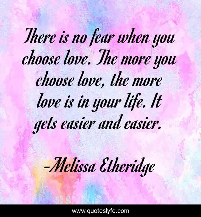 This page presents the quote "There is no fear when you choose love. The more you choose love, the more love is in your life. It gets easier and easier.". Author of this quote is Melissa Etheridge. This quote is about life, love, affection, love is,.