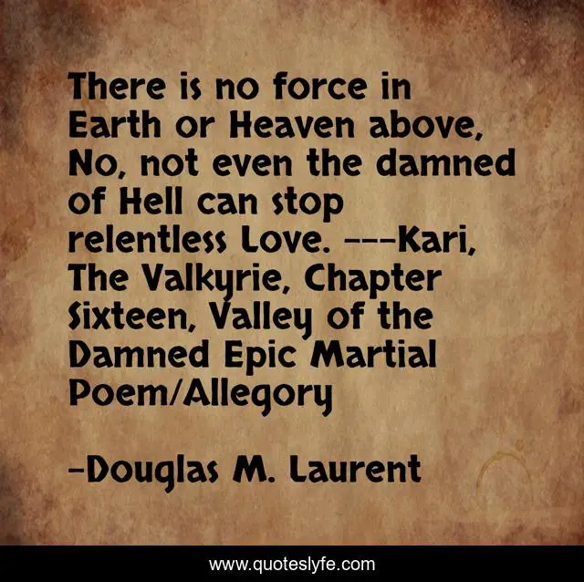 This page presents the quote "There is no force in Earth or Heaven above, No, not even the damned of Hell can stop relentless Love. ---Kari, The Valkyrie, Chapter Sixteen, Valley of the Damned Epic Martial Poem/Allegory". Author of this quote is Douglas M. Laurent. This quote is about mythology, saga, strategy, epic-poetry, spirituality, allegory, meditation, wisdom, martial-arts,.