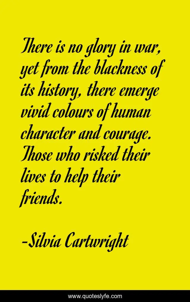 This page presents the quote "There is no glory in war, yet from the blackness of its history, there emerge vivid colours of human character and courage. Those who risked their lives to help their friends.". Author of this quote is Silvia Cartwright. This quote is about courage, friends, history,.