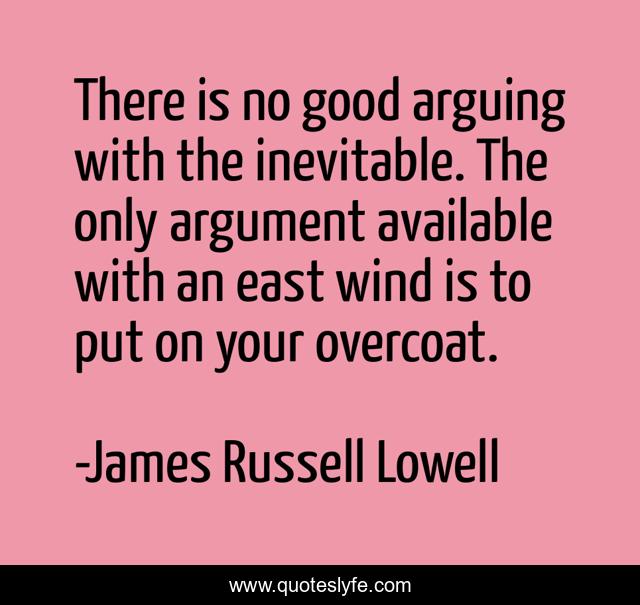 This page presents the quote "There is no good arguing with the inevitable. The only argument available with an east wind is to put on your overcoat.". Author of this quote is James Russell Lowell. This quote is about quarrels, arguments,.
