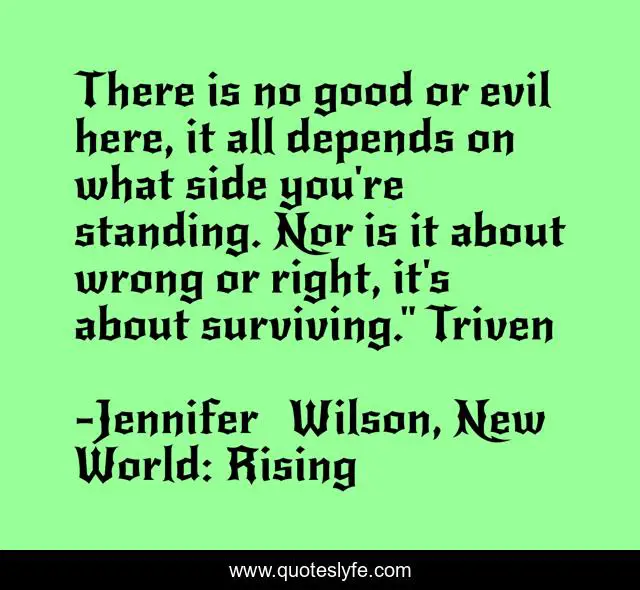 This page presents the quote "There is no good or evil here, it all depends on what side you're standing. Nor is it about wrong or right, it's about surviving." Triven". Author of this quote is Jennifer Wilson, New World: Rising. This quote is about triven, quotes, young-adult-fiction, new-world-rising, dystopian,.