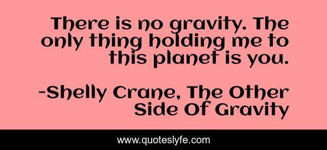 This page presents the quote "There is no gravity. The only thing holding me to this planet is you.". Author of this quote is Shelly Crane, The Other Side Of Gravity. This quote is about fate, love, science-fiction-romance, affection,.