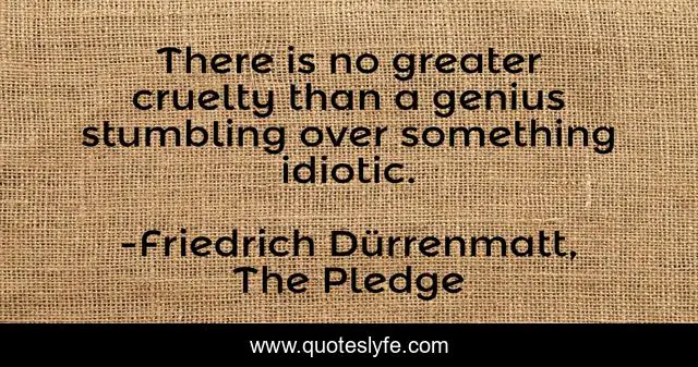 This page presents the quote "There is no greater cruelty than a genius stumbling over something idiotic.". Author of this quote is Friedrich Dürrenmatt, The Pledge. This quote is about fail, genius, irony,.