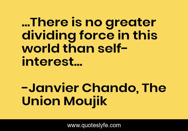 This page presents the quote "...There is no greater dividing force in this world than self-interest...". Author of this quote is Janvier Chando, The Union Moujik. This quote is about love, family, optimistic, confidence, humor, positive, romance, spirituality, enthusiasm,.
