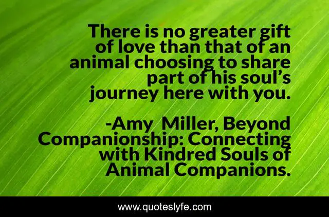 This page presents the quote "There is no greater gift of love than that of an animal choosing to share part of his soul’s journey here with you.". Author of this quote is Amy Miller, Beyond Companionship: Connecting with Kindred Souls of Animal Companions.. This quote is about animals, soul-mates, love, soul, affection,.