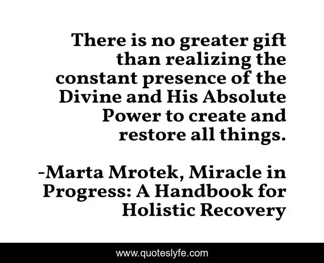 This page presents the quote "There is no greater gift than realizing the constant presence of the Divine and His Absolute Power to create and restore all things.". Author of this quote is Marta Mrotek, Miracle in Progress: A Handbook for Holistic Recovery. This quote is about restoration, higher-power, recovery, spiritual-gifts, healing,.