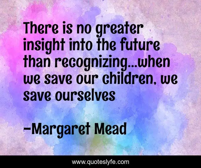 This page presents the quote "There is no greater insight into the future than recognizing...when we save our children, we save ourselves". Author of this quote is Margaret Mead. This quote is about enthusiasm, inspirational, women,.