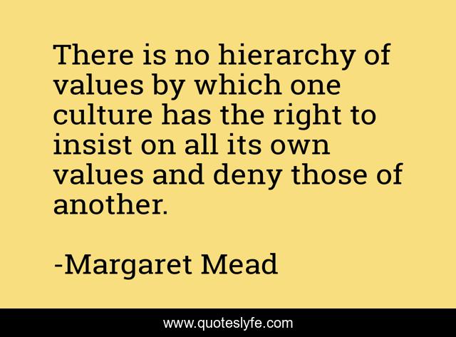 This page presents the quote "There is no hierarchy of values by which one culture has the right to insist on all its own values and deny those of another.". Author of this quote is Margaret Mead. This quote is about control, self,.