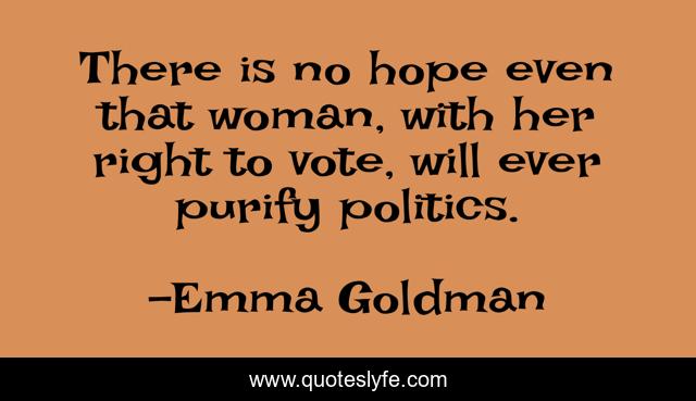 This page presents the quote "There is no hope even that woman, with her right to vote, will ever purify politics.". Author of this quote is Emma Goldman. This quote is about vote, politics, woman,.