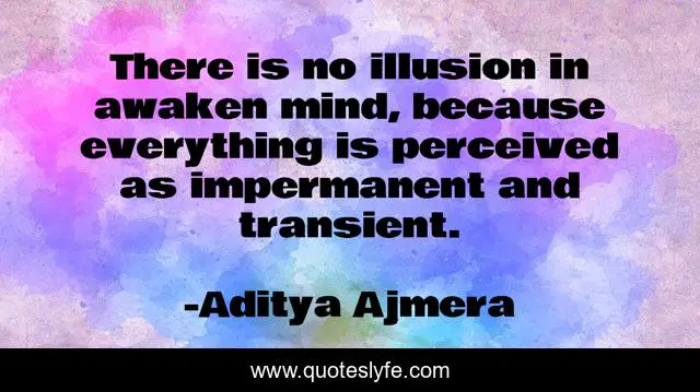 This page presents the quote "There is no illusion in awaken mind, because everything is perceived as impermanent and transient.". Author of this quote is Aditya Ajmera. This quote is about life-philosophy, mindfulness-practice, transient, illusion, impermeance,.