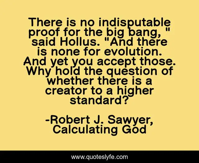 This page presents the quote "There is no indisputable proof for the big bang, " said Hollus. "And there is none for evolution. And yet you accept those. Why hold the question of whether there is a creator to a higher standard?". Author of this quote is Robert J. Sawyer, Calculating God. This quote is about macroevolution, double-standards, macro-evolution, intelligent-design, science, id, atheism, theism, big-bang,.