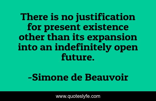 This page presents the quote "There is no justification for present existence other than its expansion into an indefinitely open future.". Author of this quote is Simone de Beauvoir. .
