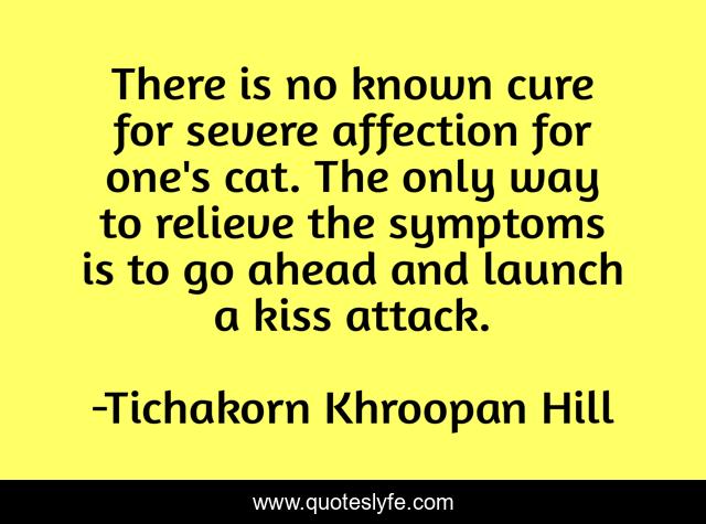 This page presents the quote "There is no known cure for severe affection for one's cat. The only way to relieve the symptoms is to go ahead and launch a kiss attack.". Author of this quote is Tichakorn Khroopan Hill. This quote is about cats, humor,.