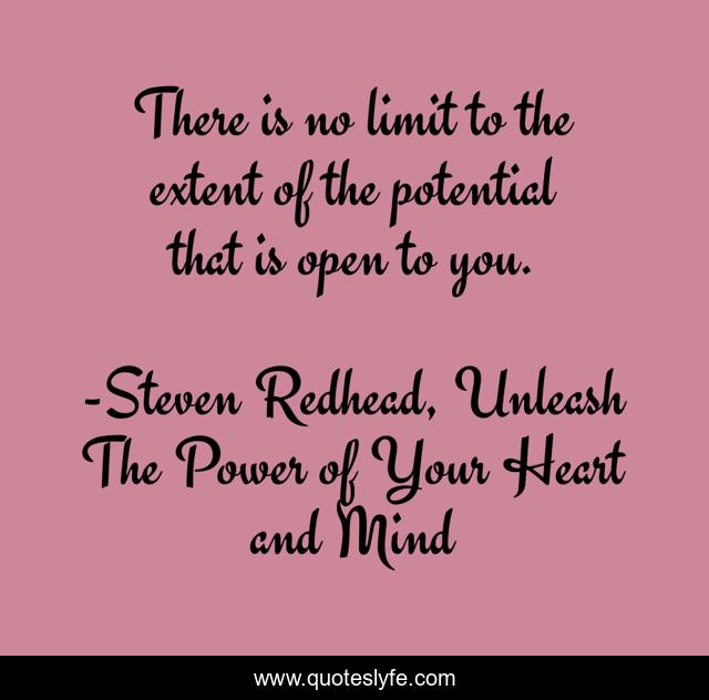 This page presents the quote "There is no limit to the extent of the potential that is open to you.". Author of this quote is Steven Redhead, Unleash The Power of Your Heart and Mind. This quote is about potential, limit, extent,.