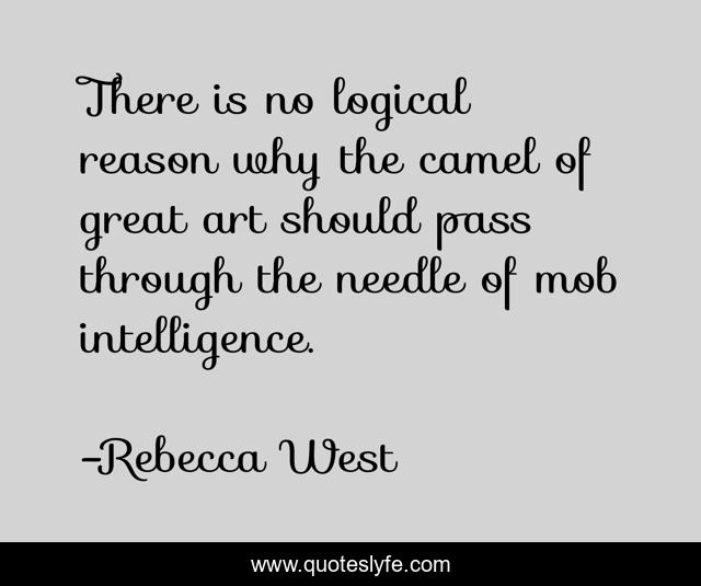 This page presents the quote "There is no logical reason why the camel of great art should pass through the needle of mob intelligence.". Author of this quote is Rebecca West. This quote is about great, art, why,.
