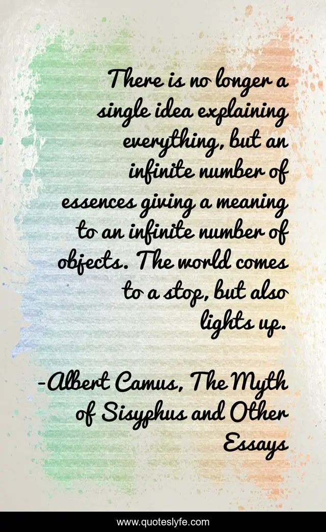 This page presents the quote "There is no longer a single idea explaining everything, but an infinite number of essences giving a meaning to an infinite number of objects. The world comes to a stop, but also lights up.". Author of this quote is Albert Camus, The Myth of Sisyphus and Other Essays. This quote is about the-world, ideas, the-myth-of-sisyphus,.