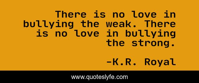 This page presents the quote "There is no love in bullying the weak. There is no love in bullying the strong.". Author of this quote is K.R. Royal. This quote is about bullying, love, affection, loving,.