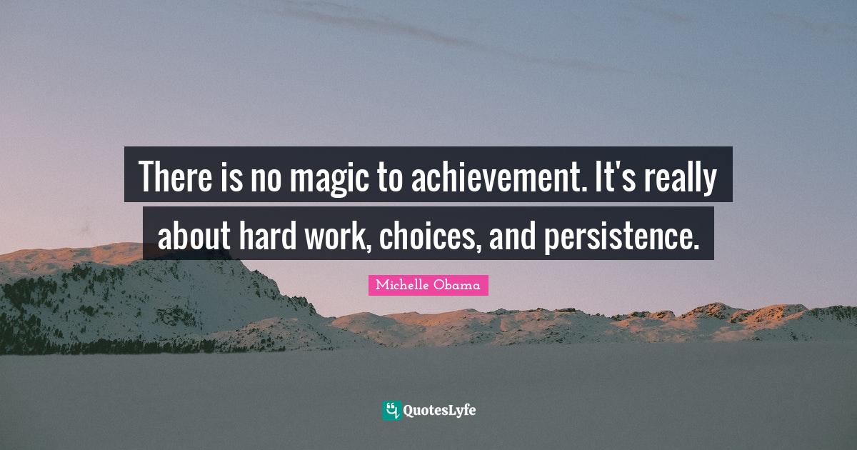 This page presents the quote "There is no magic to achievement. It's really about hard work, choices, and persistence.". Author of this quote is Michelle Obama. This quote is about persistence, magic, inspirational, achievement, choices, hard work,.