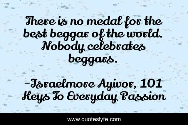 This page presents the quote "There is no medal for the best beggar of the world. Nobody celebrates beggars.". Author of this quote is Israelmore Ayivor, 101 Keys To Everyday Passion. This quote is about food-for-thought, noble-peace-prize, achievers, quotes, awards, beggars, personal-development, israelmore-ayivor, medal,.