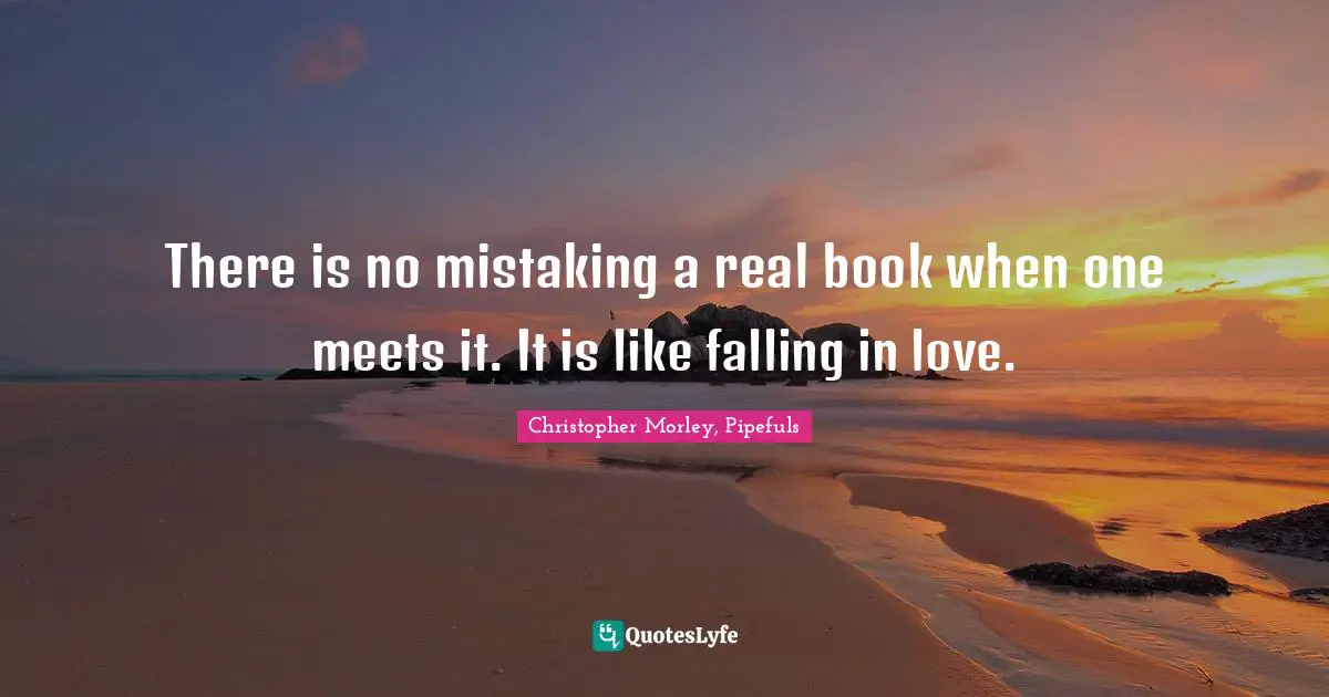 This page presents the quote "There is no mistaking a real book when one meets it. It is like falling in love.". Author of this quote is Christopher Morley, Pipefuls. This quote is about bibliophilia, books,.