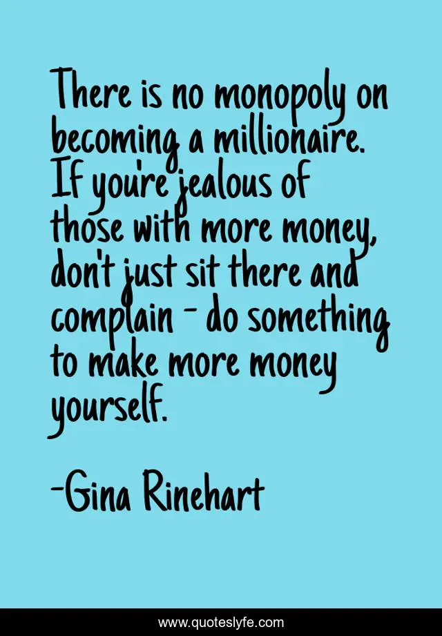 This page presents the quote "There is no monopoly on becoming a millionaire. If you're jealous of those with more money, don't just sit there and complain - do something to make more money yourself.". Author of this quote is Gina Rinehart. This quote is about jealous, yourself,.