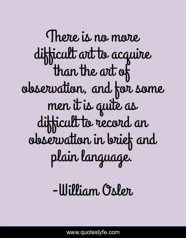 This page presents the quote "There is no more difficult art to acquire than the art of observation, and for some men it is quite as difficult to record an observation in brief and plain language.". Author of this quote is William Osler. This quote is about men, observation, language,.