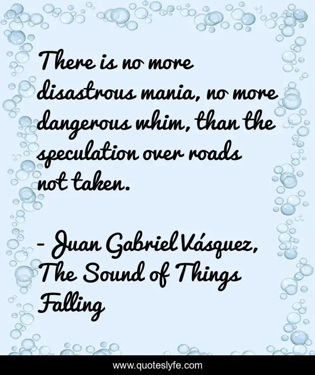 This page presents the quote "There is no more disastrous mania, no more dangerous whim, than the speculation over roads not taken.". Author of this quote is Juan Gabriel Vásquez, The Sound of Things Falling. This quote is about past, regret,.