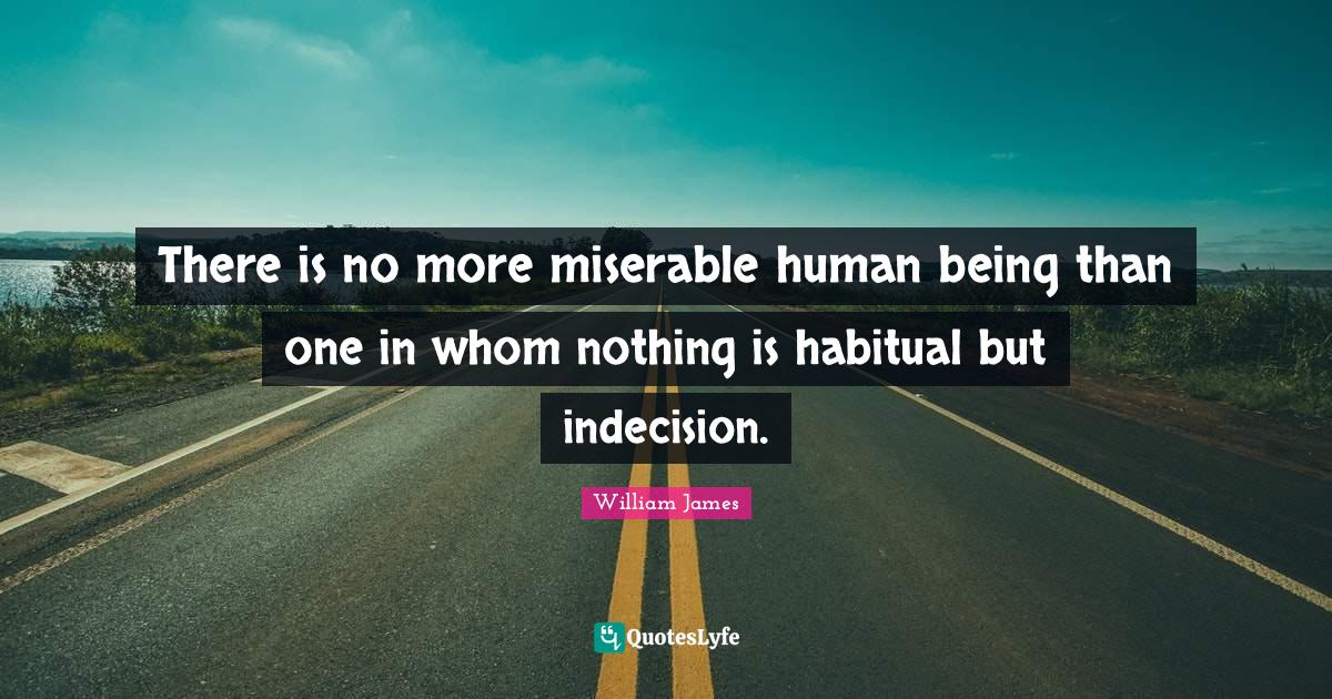 This page presents the quote "There is no more miserable human being than one in whom nothing is habitual but indecision.". Author of this quote is William James. This quote is about habits, indecision, misery,.