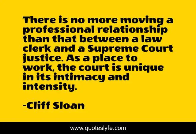 This page presents the quote "There is no more moving a professional relationship than that between a law clerk and a Supreme Court justice. As a place to work, the court is unique in its intimacy and intensity.". Author of this quote is Cliff Sloan. This quote is about justice, work, law,.