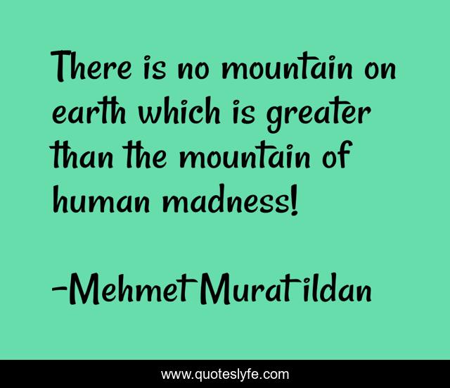 This page presents the quote "There is no mountain on earth which is greater than the mountain of human madness!". Author of this quote is Mehmet Murat ildan. This quote is about turkish-aphorisms, mountain, human-madness, madness-insanity, madness, mehmet-murat-ildan, ildan-wise-sayings, turkish, ildan-wisdom,.