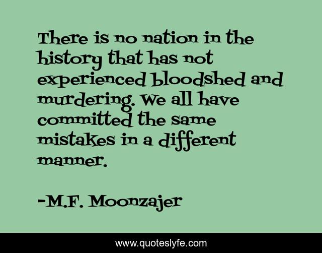 This page presents the quote "There is no nation in the history that has not experienced bloodshed and murdering. We all have committed the same mistakes in a different manner.". Author of this quote is M.F. Moonzajer. This quote is about bloodshed, murder, mistakes, nation, history,.