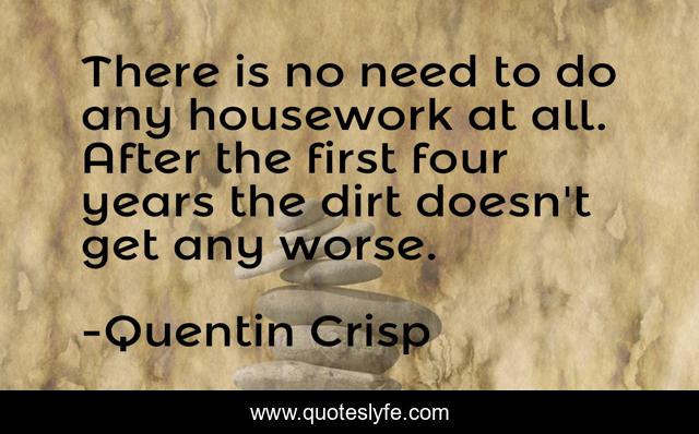 This page presents the quote "There is no need to do any housework at all. After the first four years the dirt doesn't get any worse.". Author of this quote is Quentin Crisp. This quote is about housework, humour,.