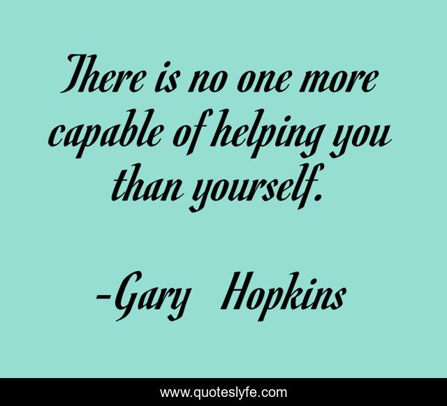 This page presents the quote "There is no one more capable of helping you than yourself.". Author of this quote is Gary Hopkins. This quote is about wisdom, oneness, self-empowerment, self-help, common-sense, self-esteem,.