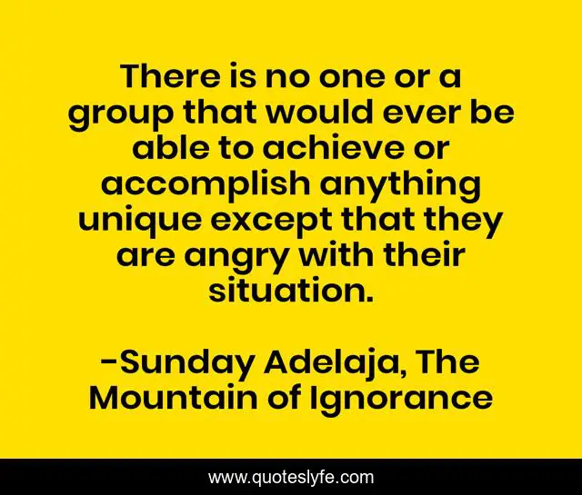 This page presents the quote "There is no one or a group that would ever be able to achieve or accomplish anything unique except that they are angry with their situation.". Author of this quote is Sunday Adelaja, The Mountain of Ignorance. This quote is about mountain, life, group, darkness, power, danger, god, accomplishment, people,.
