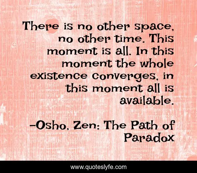 This page presents the quote "There is no other space, no other time. This moment is all. In this moment the whole existence converges, in this moment all is available.". Author of this quote is Osho, Zen: The Path of Paradox. This quote is about convergence, existence, moment, zen, time,.