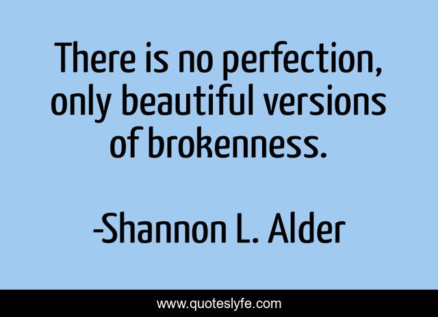 This page presents the quote "There is no perfection, only beautiful versions of brokenness.". Author of this quote is Shannon L. Alder. This quote is about beautiful, living, brokeness, love, perfectionism, souls, change, broken, connection,.