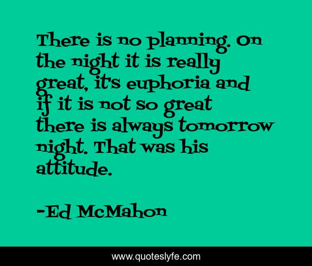 This page presents the quote "There is no planning. On the night it is really great, it's euphoria and if it is not so great there is always tomorrow night. That was his attitude.". Author of this quote is Ed McMahon. This quote is about great, tomorrow, night,.