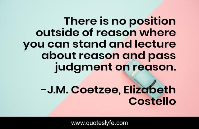 This page presents the quote "There is no position outside of reason where you can stand and lecture about reason and pass judgment on reason.". Author of this quote is J.M. Coetzee, Elizabeth Costello. This quote is about reason, philosophy,.