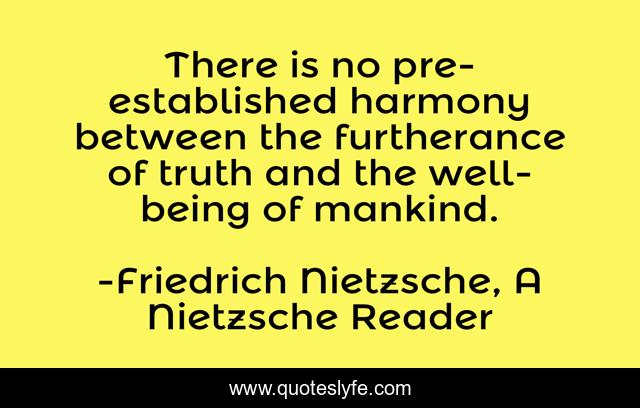 This page presents the quote "There is no pre-established harmony between the furtherance of truth and the well-being of mankind.". Author of this quote is Friedrich Nietzsche, A Nietzsche Reader. This quote is about humanity, truth,.