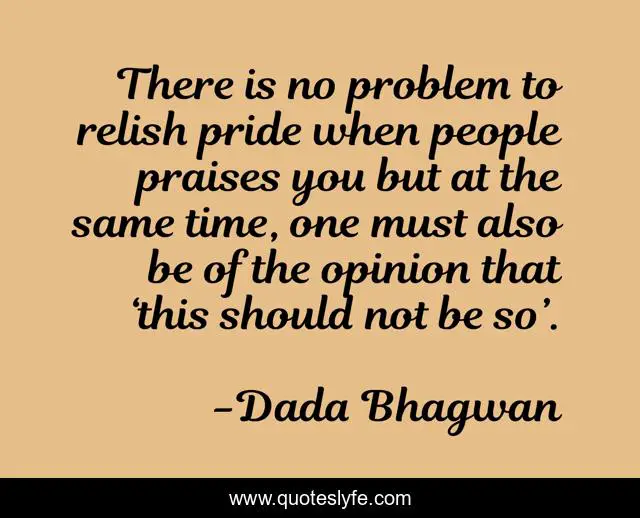 This page presents the quote "There is no problem to relish pride when people praises you but at the same time, one must also be of the opinion that ‘this should not be so’.". Author of this quote is Dada Bhagwan. This quote is about spiritual, pride, ego, praise,.