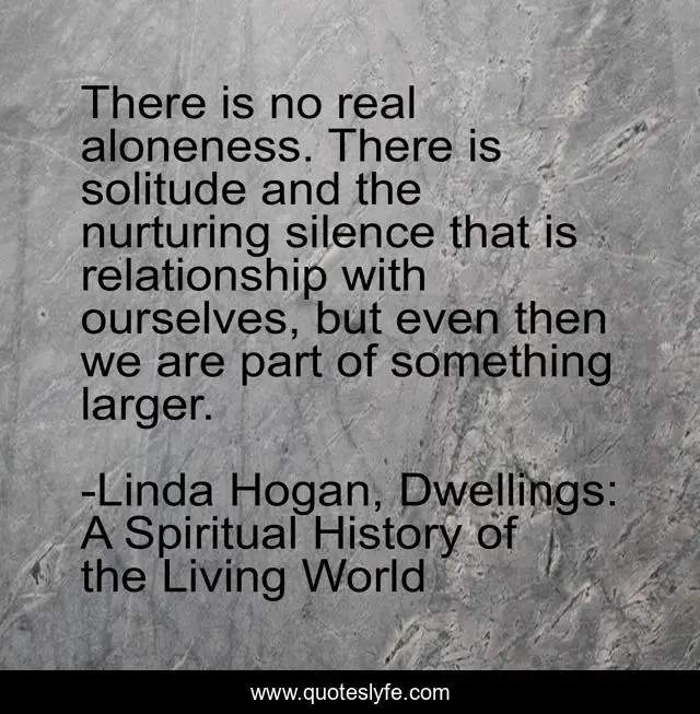 This page presents the quote "There is no real aloneness. There is solitude and the nurturing silence that is relationship with ourselves, but even then we are part of something larger.". Author of this quote is Linda Hogan, Dwellings: A Spiritual History of the Living World. This quote is about spirituality, dwellings, native-american-wisdom, nature,.