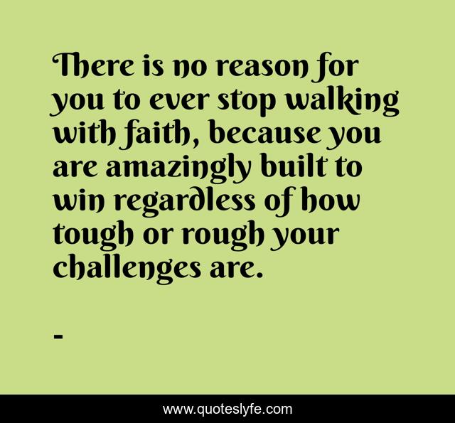 This page presents the quote "There is no reason for you to ever stop walking with faith, because you are amazingly built to win regardless of how tough or rough your challenges are.". Author of this quote is . This quote is about tough, walking-with-faith, edmond-mbiaka, you-are-winner, your-challenges, walk-with-faith, you-are-built-to-win, rough,.