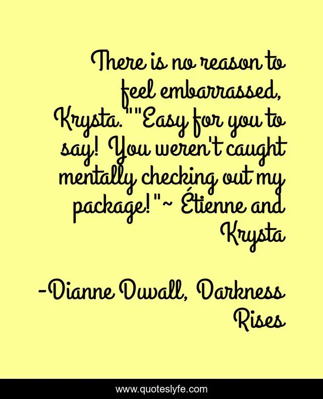 This page presents the quote "There is no reason to feel embarrassed, Krysta.""Easy for you to say! You weren't caught mentally checking out my package!"~ Étienne and Krysta". Author of this quote is Dianne Duvall, Darkness Rises. This quote is about humor, immortal-guardians, vampire, immortal, romance, paranormal-romance,.