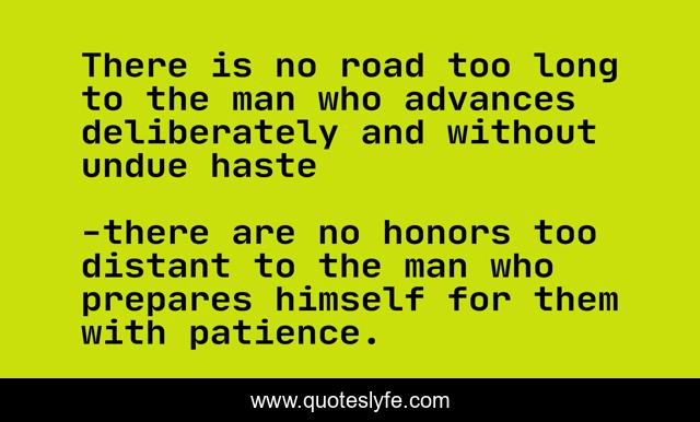 This page presents the quote "There is no road too long to the man who advances deliberately and without undue haste". Author of this quote is there are no honors too distant to the man who prepares himself for them with patience.. .
