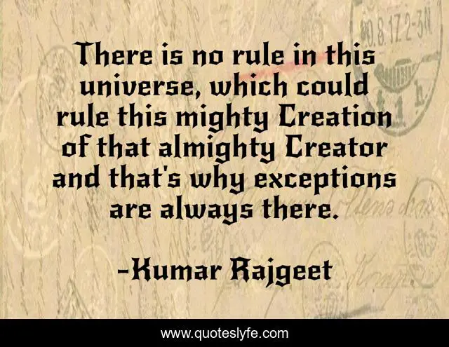 This page presents the quote "There is no rule in this universe, which could rule this mighty Creation of that almighty Creator and that's why exceptions are always there.". Author of this quote is Kumar Rajgeet. .
