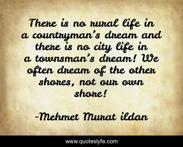 This page presents the quote "There is no rural life in a countryman’s dream and there is no city life in a townsman’s dream! We often dream of the other shores, not our own shore!". Author of this quote is Mehmet Murat ildan. This quote is about mehmet-murat-ildan, turkish, peasant-life, turkish-writers, townsman, turkish-literature, rural-life, city-dweller, dreams,.