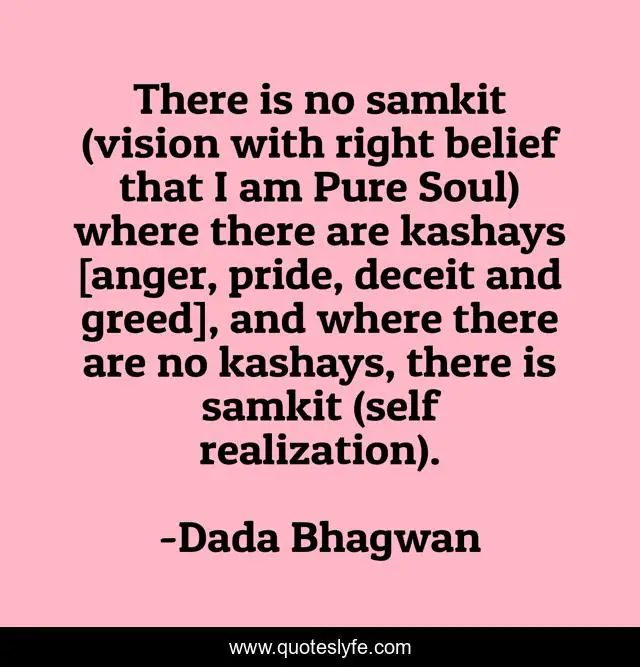 This page presents the quote "There is no samkit (vision with right belief that I am Pure Soul) where there are kashays [anger, pride, deceit and greed], and where there are no kashays, there is samkit (self realization).". Author of this quote is Dada Bhagwan. This quote is about spiritual, kashay, self, soul, atma, self-realization, anger, greed, deceit,.