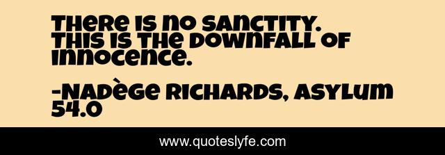 This page presents the quote "There is no sanctity. This is the downfall of innocence.". Author of this quote is Nadège Richards, Asylum 54.0. This quote is about dystopia, end-of-world, downfall, no-sanctity, innocence, war,.